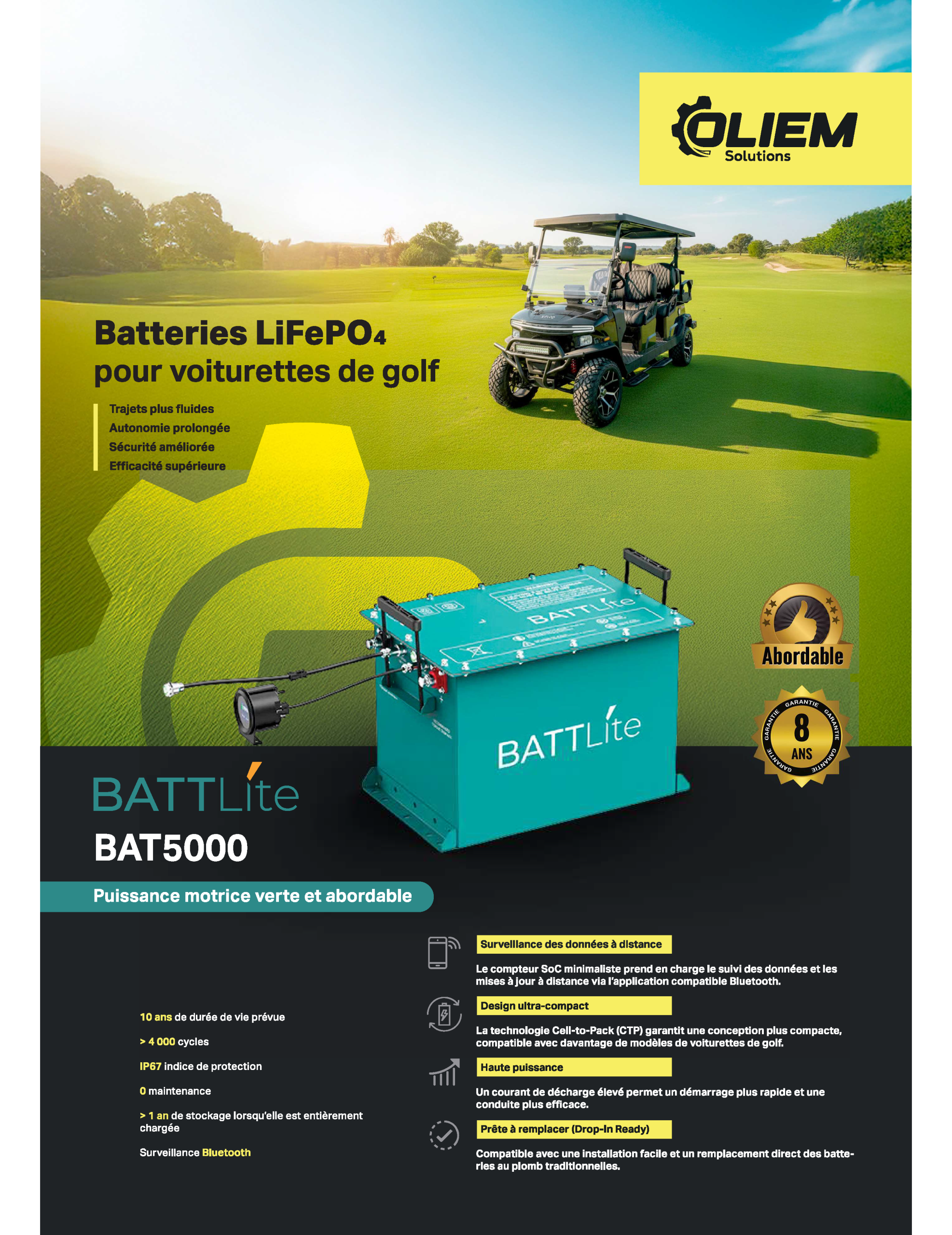 La batterie lithium conçue pour remplacer facilement la batterie au plomb dans vos voiturettes de golf. La batterie Roypow est une batterie lithium-ion avancée avec système de batterie intégré, qui peut protéger votre flotte contre les surchauffes, les courts-circuits, les surtensions, etc., de sorte qu’elle peut efficacement éviter les risques de sécurité potentiels pour prolonger sa durée de vie et optimiser ses performances. En les batteries lithium Roypow la durée de vie de la batterie de 10 ans et la garantie de 5 ans vous apportent la tranquillité d’esprit. Pas de remplissage d’eau, pas de serrage de borne et de nettoyage des dépôts d’acide, et vous n’avez plus à payer de frais de personnel pour le remplissage d’eau.